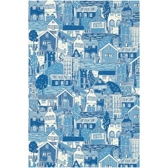 It’s a blue skied summer’s day in the Swedish capital, as overlaid buildings in a mixture of scales jostle for attention to create this playful, higgledy-piggledy design. Spot the cheerful cyclist and flowing river as they gently meander by in this beautifully coloured lino cut wallpaper.