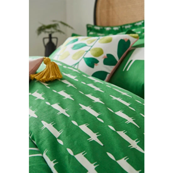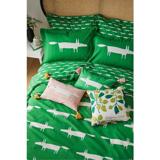 The iconic Mr Fox makes his mint leaf green debut in bedding. Mixing it up on the size scale, large fox features on the front with mini fox on the reverse. His style knows no limit. Made from 100% cotton, the Oxford pillowcase is included in the set, featuring one statement fox on the front and small-scale foxes on the reverse, all neatly packaged in a fabric bag made from duvet material for a happier, more stylish planet.