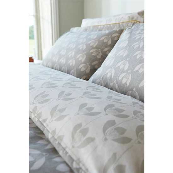 The duvet cover (single, double, king and super king) features an allover stylised snowdrop flower head, pigment-printed on a grey ground, the design is reflected on the reverse in the contrasting colour way and piped in mustard.