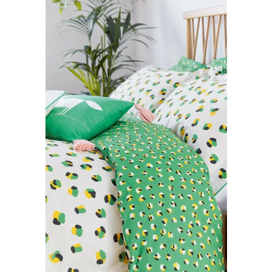 This fun-loving, animalistic design in pebble and mint leaf plays with sassy leopard spots that have a hint of green. The reverse is a micro leopard print on a green background. Crafted from 100% cotton certified by the Better Cotton, including an Oxford pillowcase in the same design, Leopard Dots sets come in fabric bags crafted from the same duvet cotton material for a happier planet.