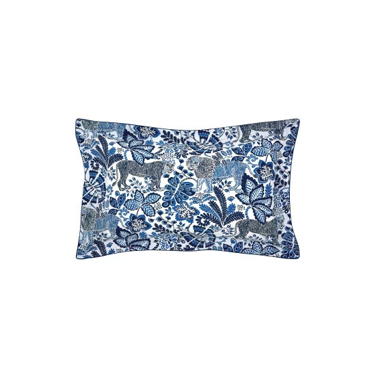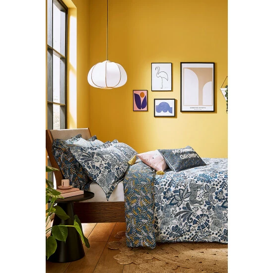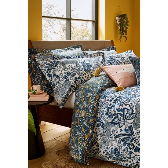 For a walk on the wild side, Rumble in the Jungle in denim blue comes to life with a moody lion motif, almost in camouflage against an exotic jungle pattern. Wild and yet tonal, the lion motifs peek out from amongst jungle foliage. 100% cotton certified by the Better Cotton the duvet has a small-scale leaf and berry pattern with ochre and blushes tones highlighted by the navy base. Included in the set is the matching Oxford pillowcase, all packaged up in a fabric bag made from the duvet fabric.