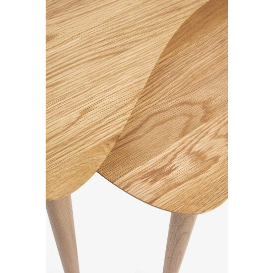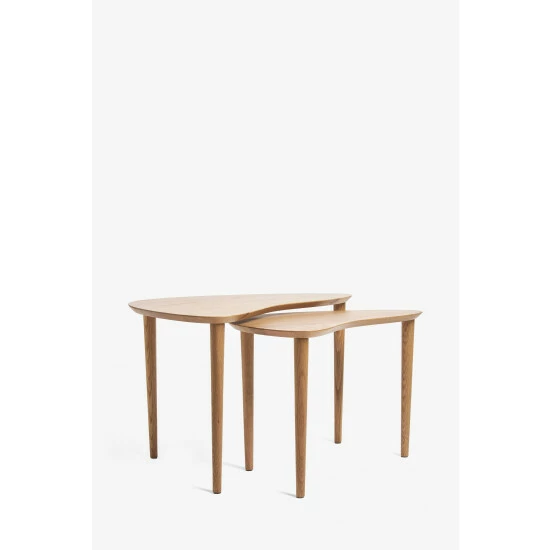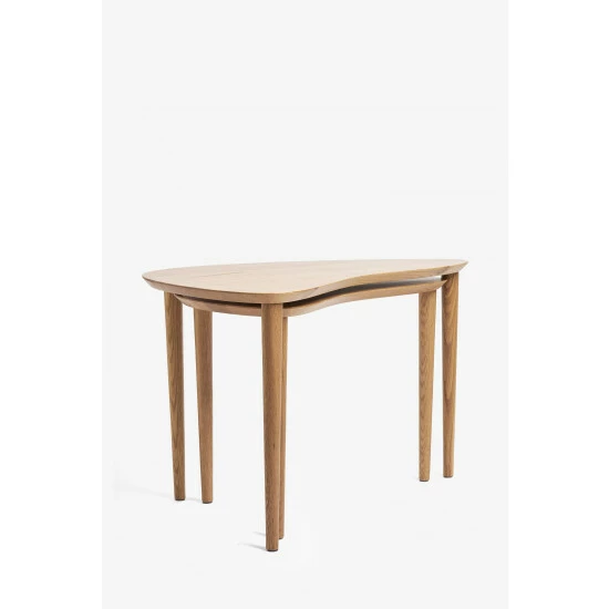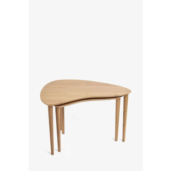 This handy nest of two tables is a perfect spot to rest drinks and magazines. Made from solid oak, its kidney shape design introduces a mid-century, wrap around style. Compact, versatile and easy to use, pair alongside contemporary sofas or statement arm chairs to complete the look.