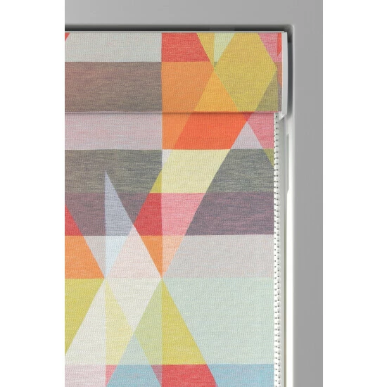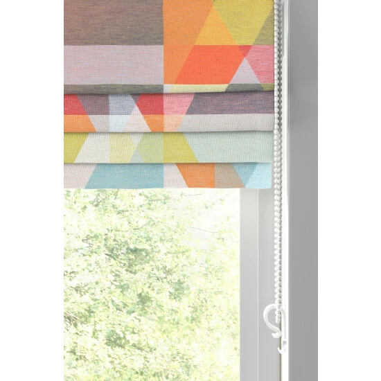 Glorious kaleidoscopic mix of geometric shapes in a fun colour, makes this made to measure Roman Blind stand out. If a blackout lining is selected it would look stunning in a bedroom.